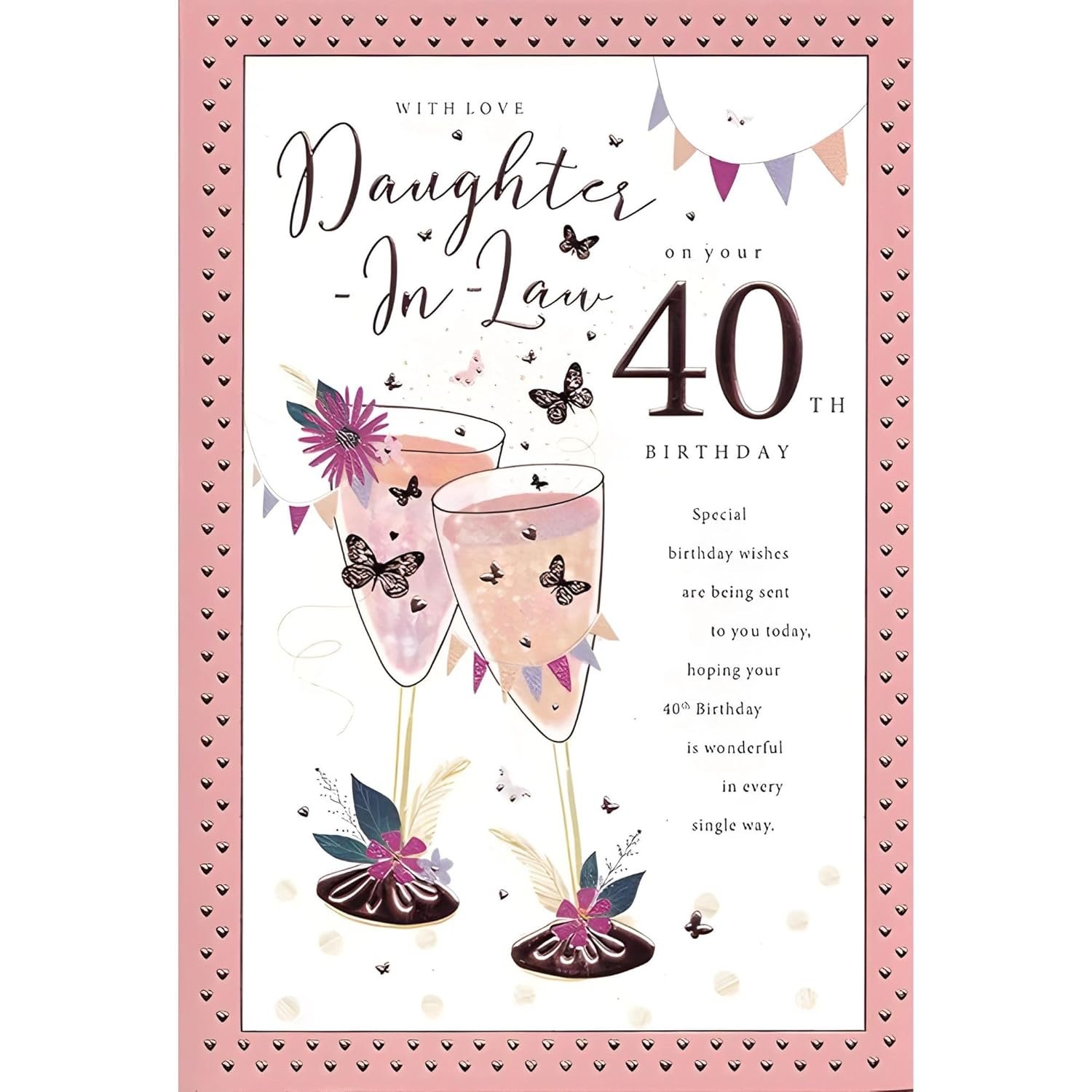 ICG Daughter-in-Law 40th Birthday Card & Envelope – Gold Flutes, Flowers & Present Design Approximate Size: 9″ x 6″ (23cm x 15cm) On the front the card reads: Just For You Daughter-in-Law On Your 40th Birthday & inside is printed with the same design and reads: Special birthday wishes are being sent to you today, hoping your 40th birthday is wonderful in every single way. Happy 40th Birthday